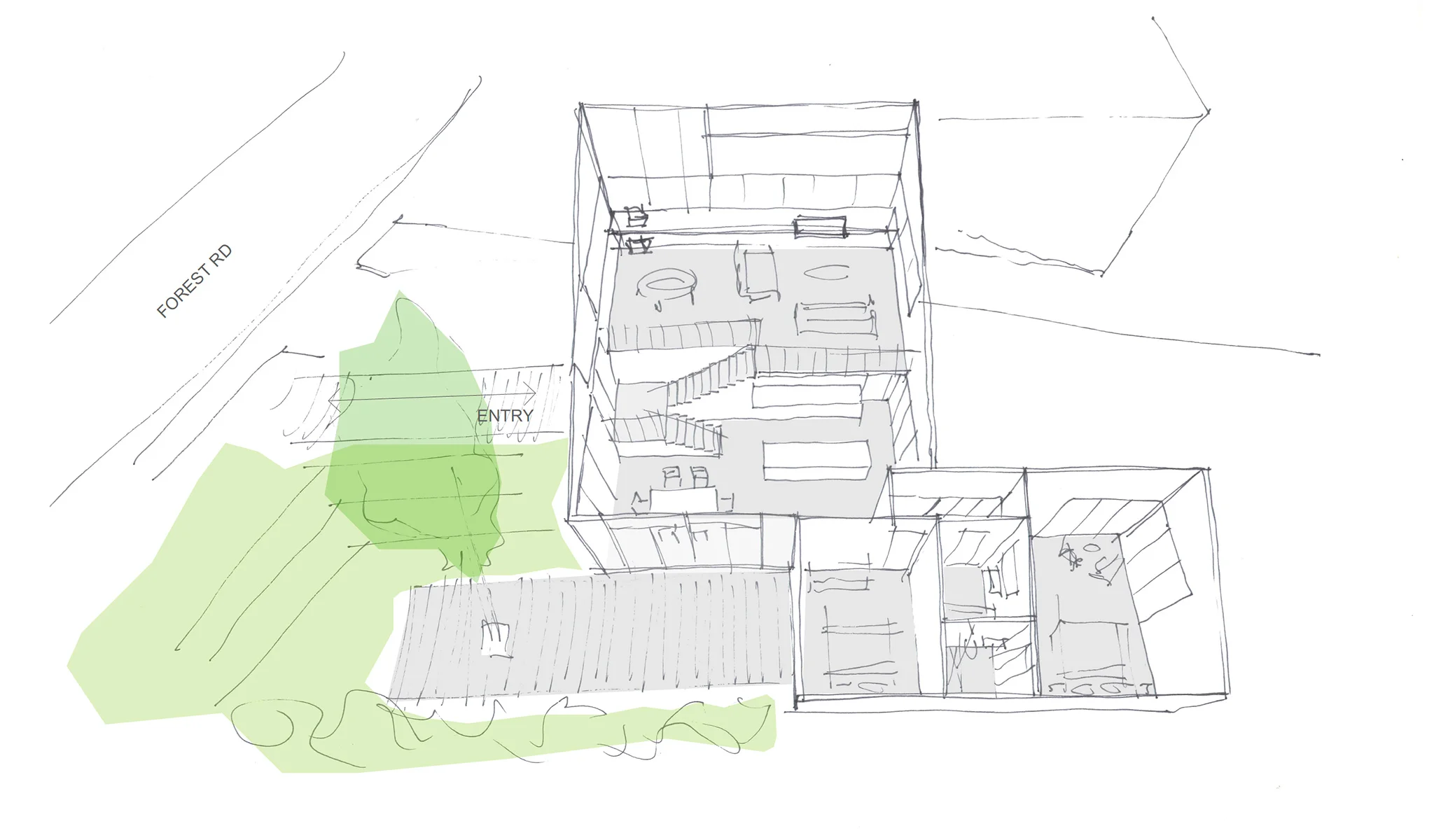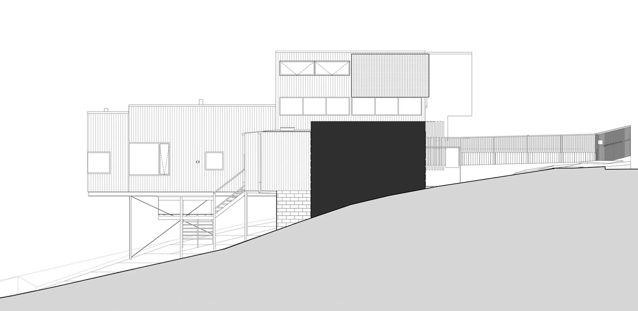 This new family home is located high on a steep lot in west Hobart. The long views over the city and river Derwent are screened by the bulk of the neighbour’s house. In response, our design steps up to peek over, with the living room enjoying a 180 degrees panorama. On the low side a kitchen and dining room open onto a private front garden and terrace, beneath the powerful presence of Kunanyi rising to the west. The house becomes a viewing device, moulded to connect this family to the water, city, mountain and gardens.