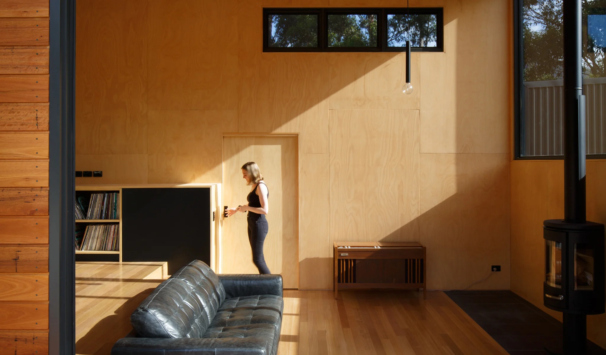 A limited budget called for careful selection of materials and a compact floor plan, while high ceilings and careful placement of windows created a grand sense of space and openness. The internal hoop ply lining is light, warm and homely, while the external dark metal cladding is a robust protective skin that visually recedes into the bush.